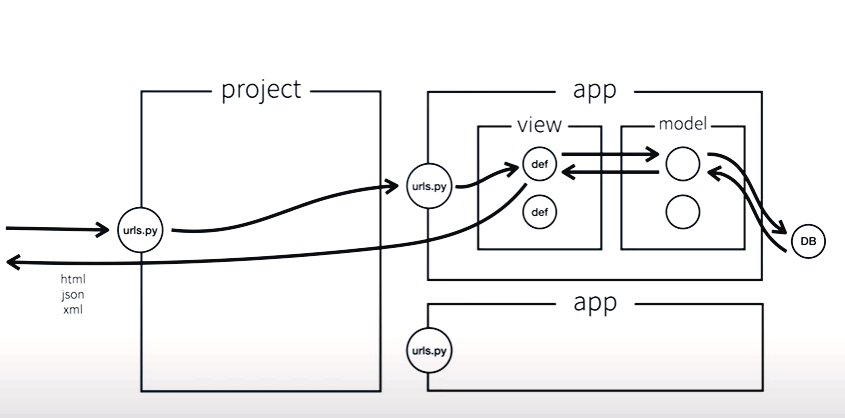 프로젝트에 해당하는 urls.py는 여러 앱들에 대한 목록을 가지고 있어서 사용자의 요청에 맞게 데이터를 뷰, 모델, db를 거쳐 요청에 맞는 응답을 제공해주는 것이 django의 기본적인 구조